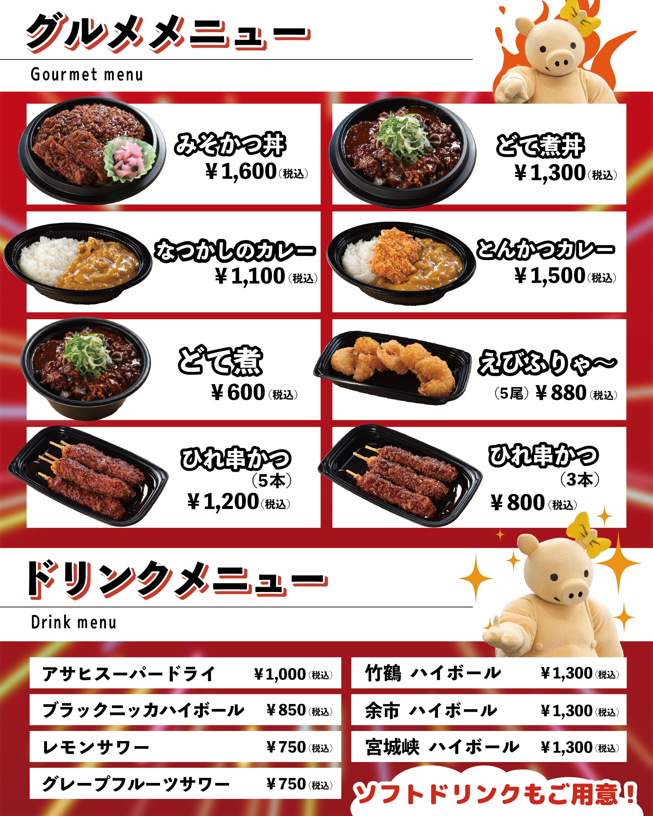 グルメメニューは、みそかつ丼、どて煮丼、ひれ串かつなど、ライブや観戦前の腹ごしらえにぴったりなラインナップ!